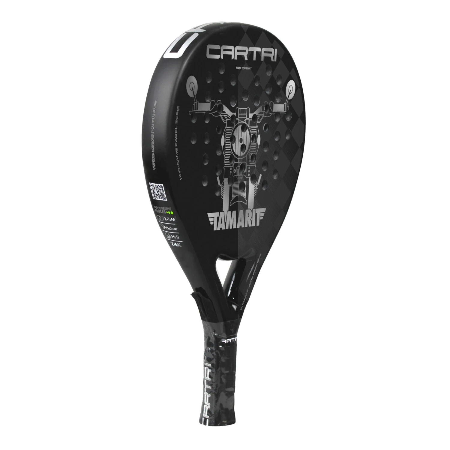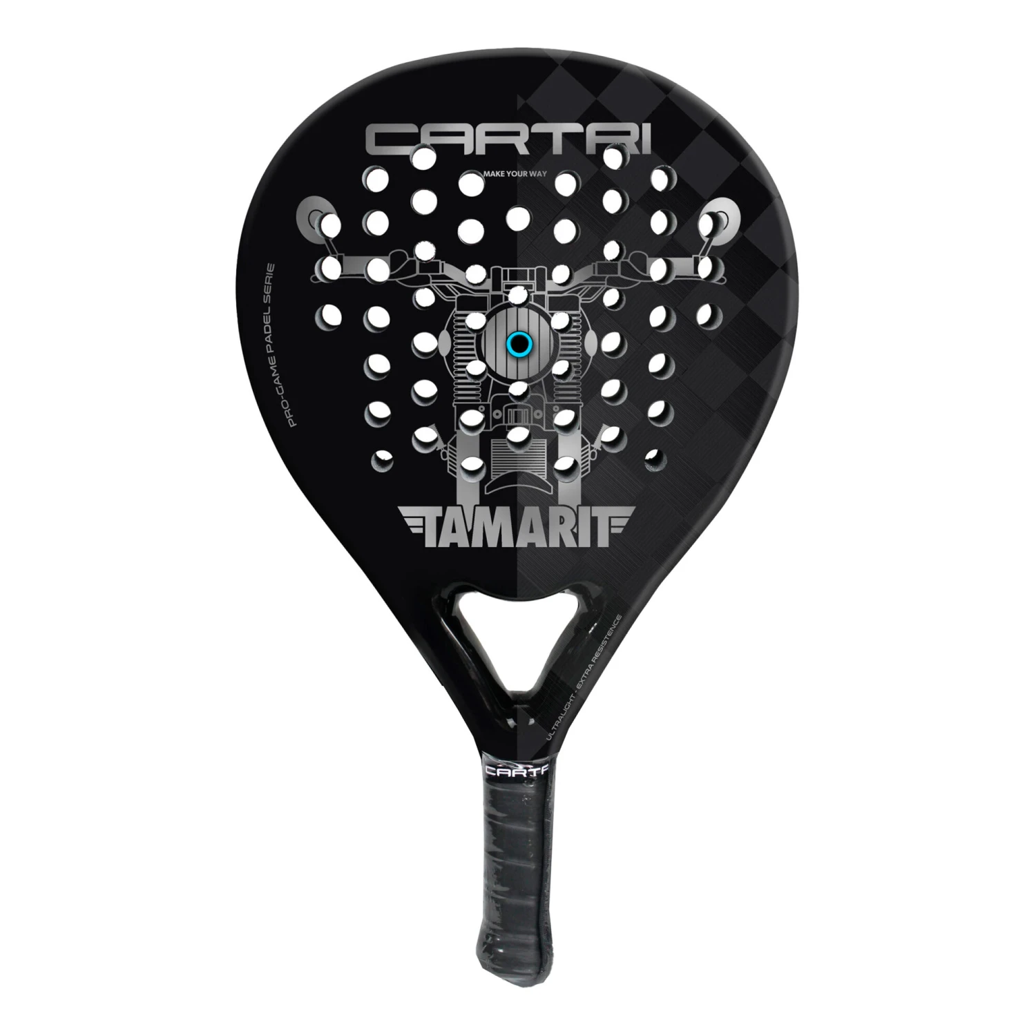 Enjoy your Cartri racket like never before thanks to a new concept that increases the stability of the frame through a careful structure that accelerates the exit of the ball to the maximum and gives a millimeter precision to each hit. Follow the legend of the Shield Blue Cartri padel racket!